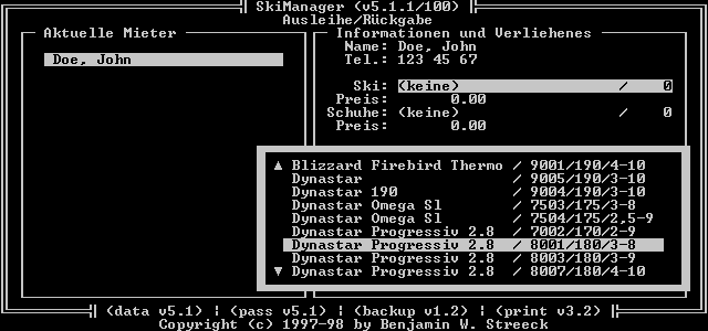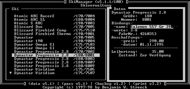 Dieses Programm dient der Verwaltung und Vermietung von Ski und Skischuhen.